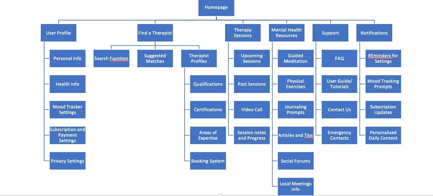 Through extensive research, including competitive audits, user journey mapping, and persona development, I identified key pain points such as the need for privacy, transparency in therapist qualifications, and simplified navigation. Using Figma and Adobe XD, I iteratively developed wireframes, prototypes, and high-fidelity mockups that prioritized accessibility and ease of use.