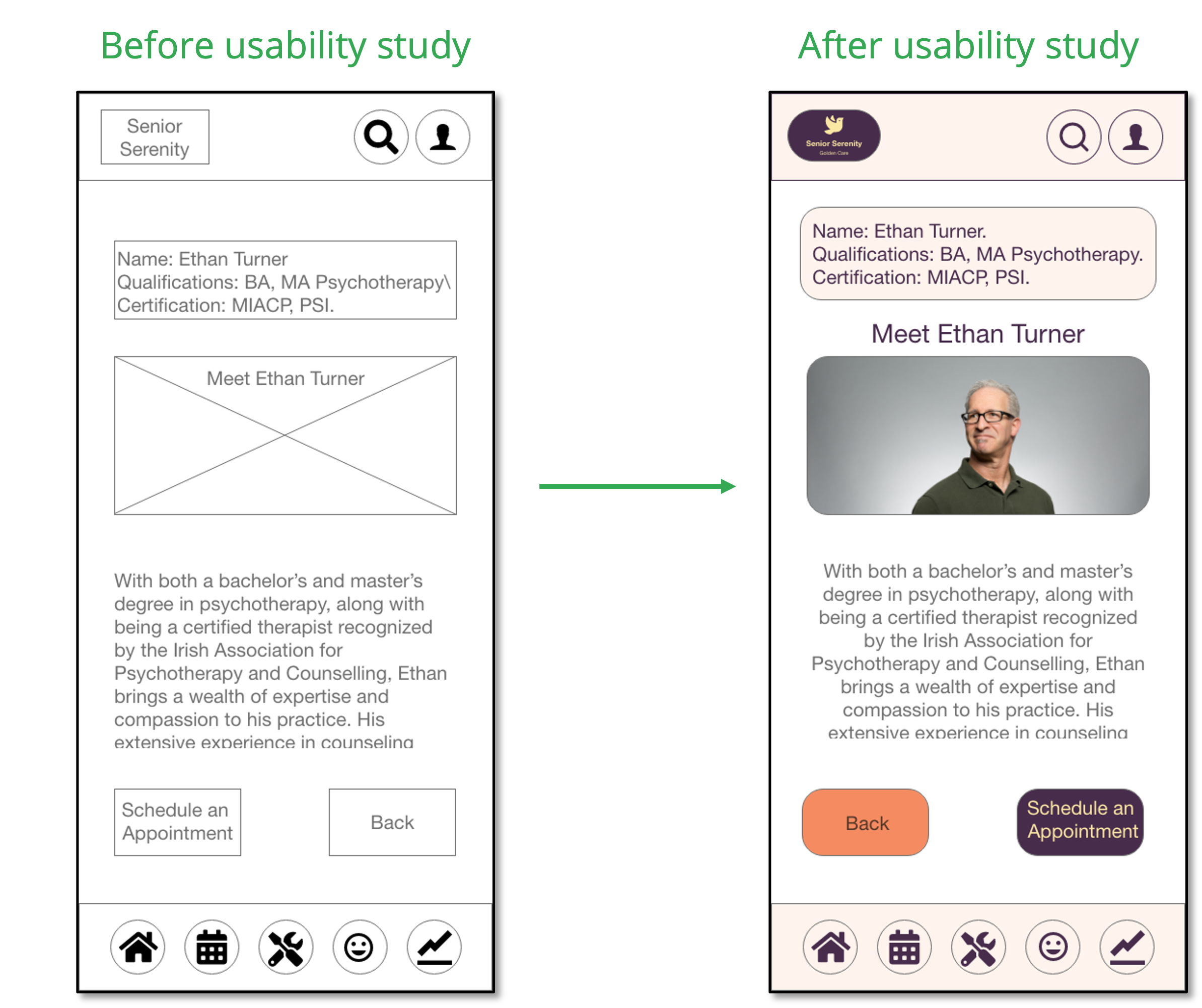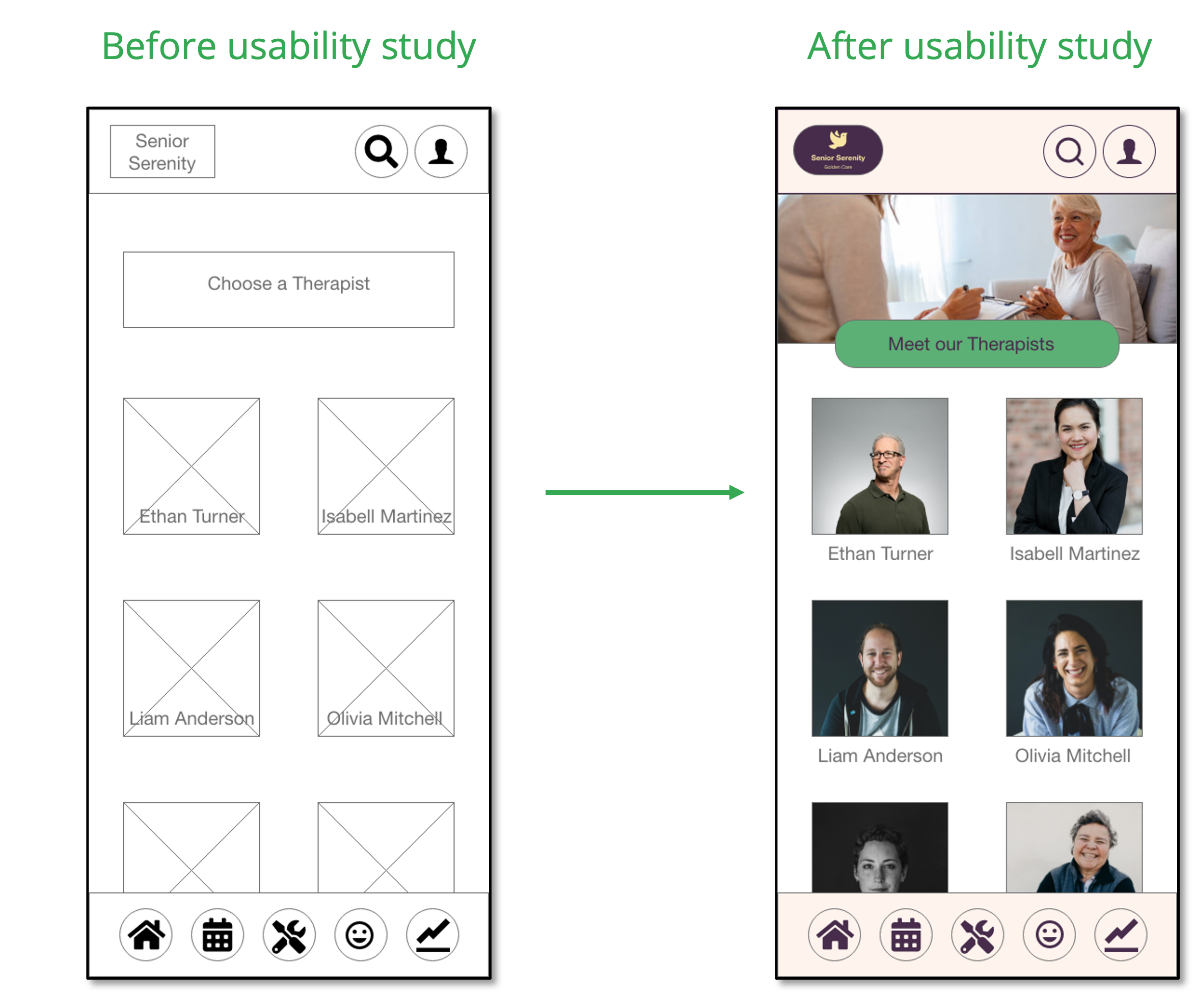 The user group confirmed initial assumptions about Senior Serenity customers, but research also revealed that online access was not the only factor creating frustration for users. Other user concerns included frustration over the platform's limited accessibility features for individuals with limited technological skills, as well as a lack of transparency regarding therapists' qualifications and assurances of privacy.