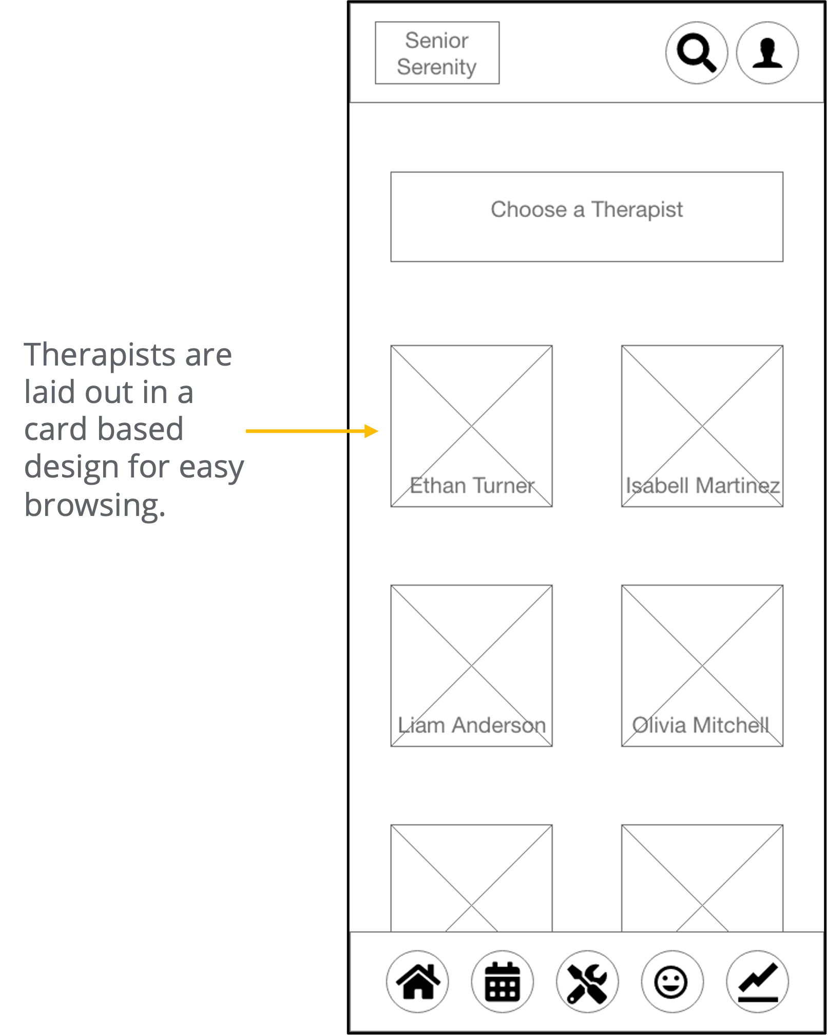A card-based formatting design was chosen to simplify therapist browsing. Users can select a therapist and view further details credentials and specialties.