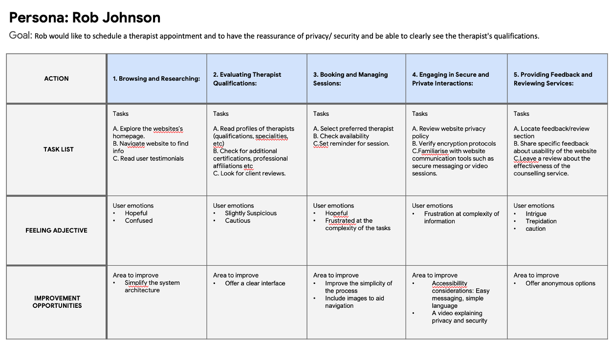Additionally, I mapped the user journey to gain a deep understanding of the challenges seniors face when accessing online mental health support. From this research, the problem statement emerged: