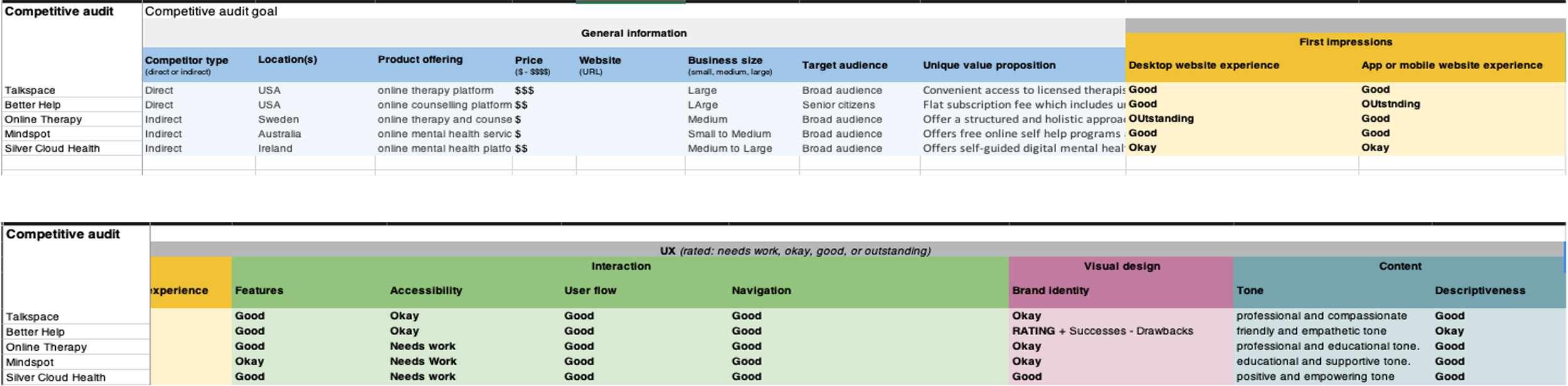 To guide the development of Senior Serenity, I conducted a comprehensive competitive audit to identify gaps and opportunities in existing mental health platforms. This audit highlighted areas where we could innovate and better serve our target audience.